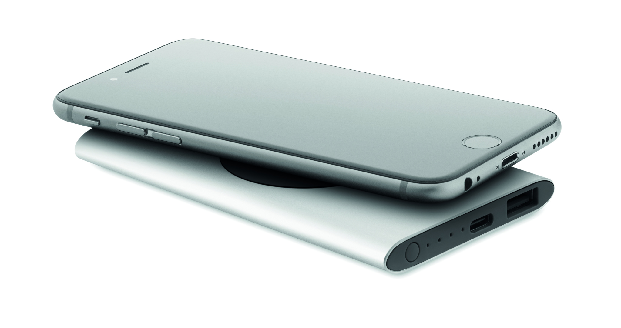 Powerbank 5000 mAh mit kabelloser Ladestation 15W aus recyceltem Aluminium. Eingang: Typ-C. Ausgang: 1 x Typ-C & 1 x Typ-A. Ausgangsstrom DC5V/2A. Kompatibel mit den neuesten Androiden, iPhone® 8, 8S und X und neueren Modellen.