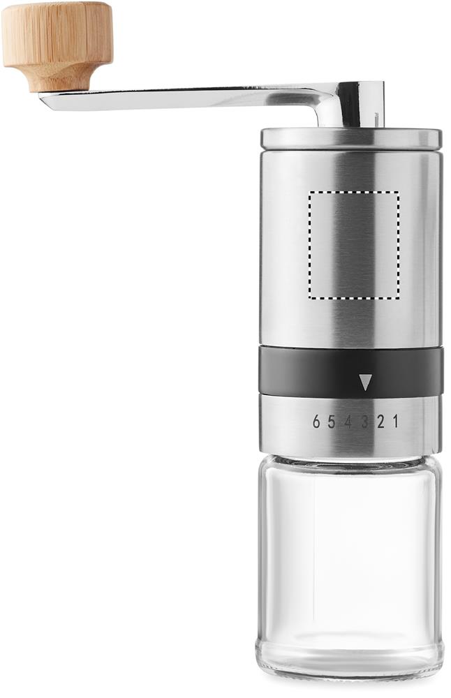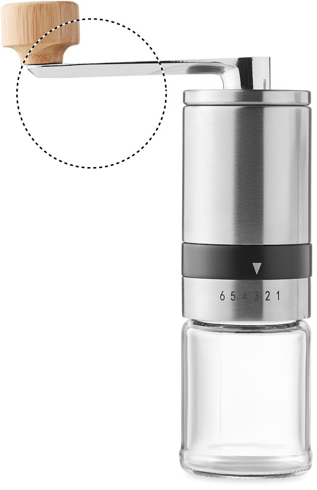 Coffee set. Including glass and stainless steel cafetiere and manual ceramic coffee grinder with bambo details. Capacity: cafetiere 350ml, grinder 100ml.