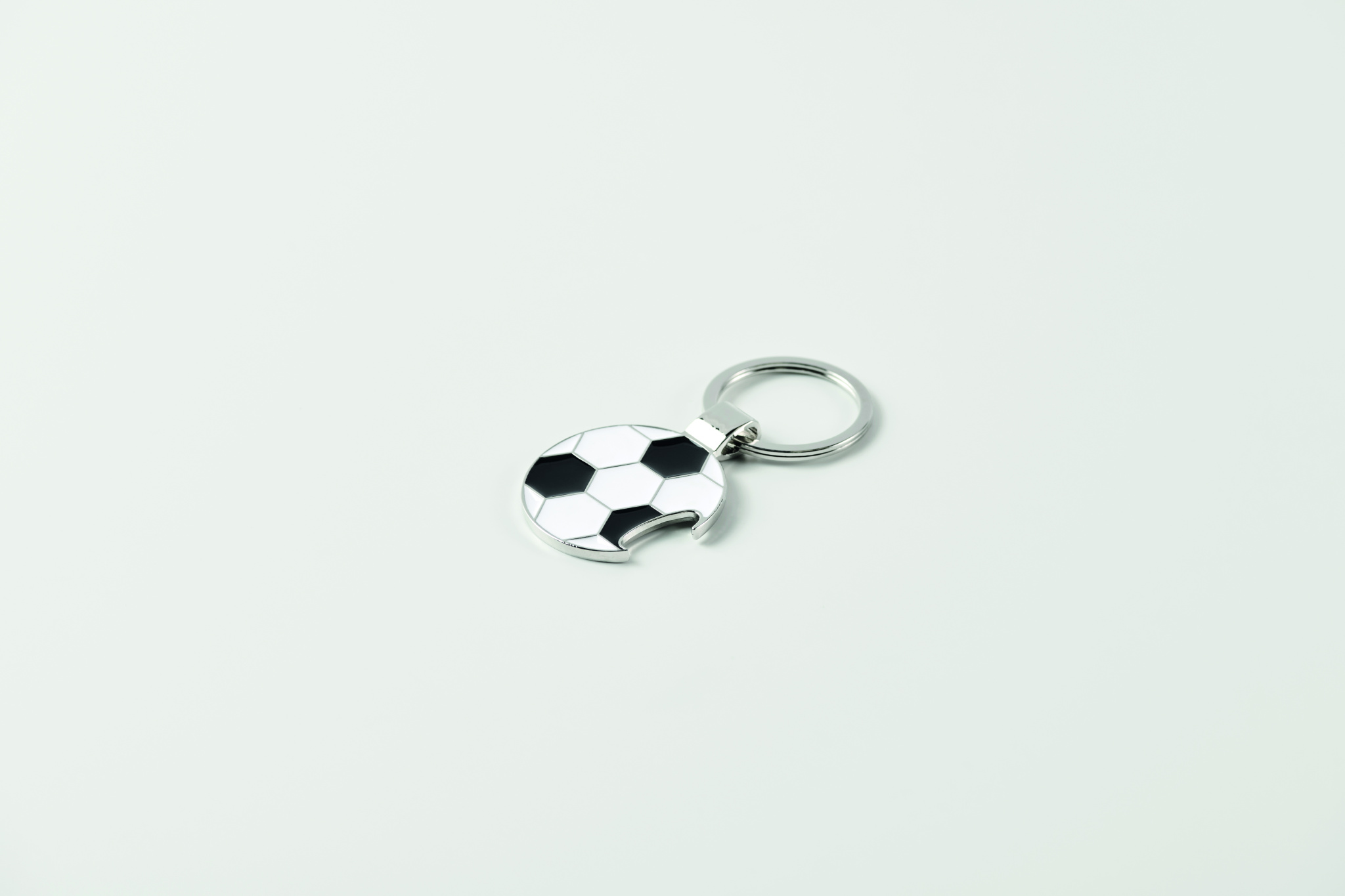 Football-shaped bottle opener keyring made of zinc alloy with iron ring.