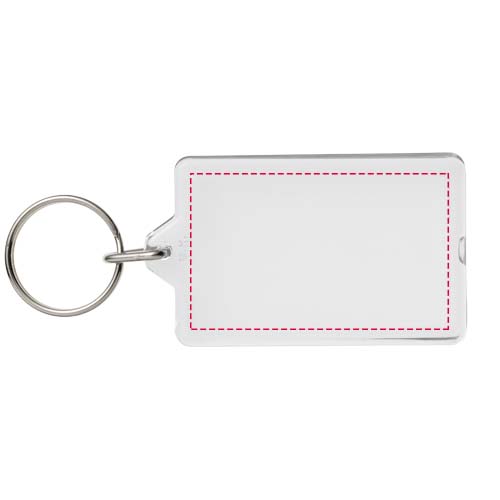 Clear rectangular G1 keychain with metal split keyring. This keychain is reopenable with a coin. The metal looped ring offers a flat profile which is ideal for mailings. Print insert dimensions: 5,0 cm x 3,0 cm.