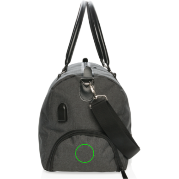 Modern and minimalist 600D polyester weekend bag with PU handles & comfortable shoulder strap. Large main compartment with plenty of room for your weekend necessities or sports gear. Connect your powerbank easily to the integrated USB A charging port and charge your phone or tablet whilst on the go. Also comes with quick access pocket on the right. PVC free.