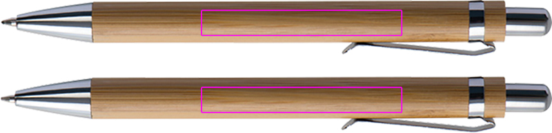 Writing set made of bamboo, including a blue-writing ballpen and a mechanical pencil in a cardboard case. We engrave your logo below the clip on both pens.