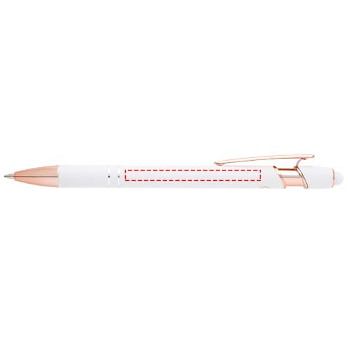 Roosa kuldse viimistlusega Nanna pastapliiatsil on taaskasutatud alumiiniumist silikoonist puutepliiatsiga toru. Taaskasutatud alumiinium vähendab prügilatesse sattuvate jäätmete hulka ja aitab säästa loodusvarasid, et vähendada kasvuhoonegaaside heitkoguseid. Tindi värv: must. Kirjutamise pikkus: 800 meetrit. Otsa suurus: 1,0 mm.