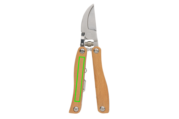 Aia multitööriist, mis on valmistatud FSC 100% pöögipuidust, kõrge kõvadusega ja korrosioonikindlast roostevabast terasest (420). Rockwelli kõvadus 42-52. Tootel on 10 funktsiooni: aiakäärid, lukk, kruvikeeraja, viil, juureeemaldaja, nuga, labidas, saag, umbrohu eemaldamise konks, umbrohutõrjevahend. Pakitud FSC mix kraft karpi.