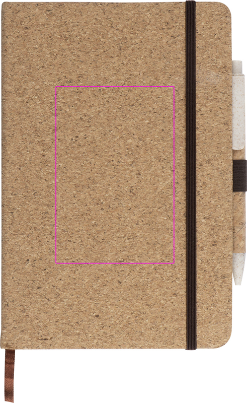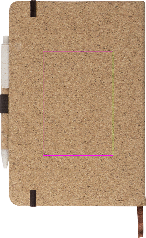 A5-muistivihko korkkikannessa, 160 pilkullista sivua, joustava hihna, kynälenkki ja vehnäolkikuulakynä korkkipinnoitteella pahvilaatikossa. Logo painetaan kirjaan.
