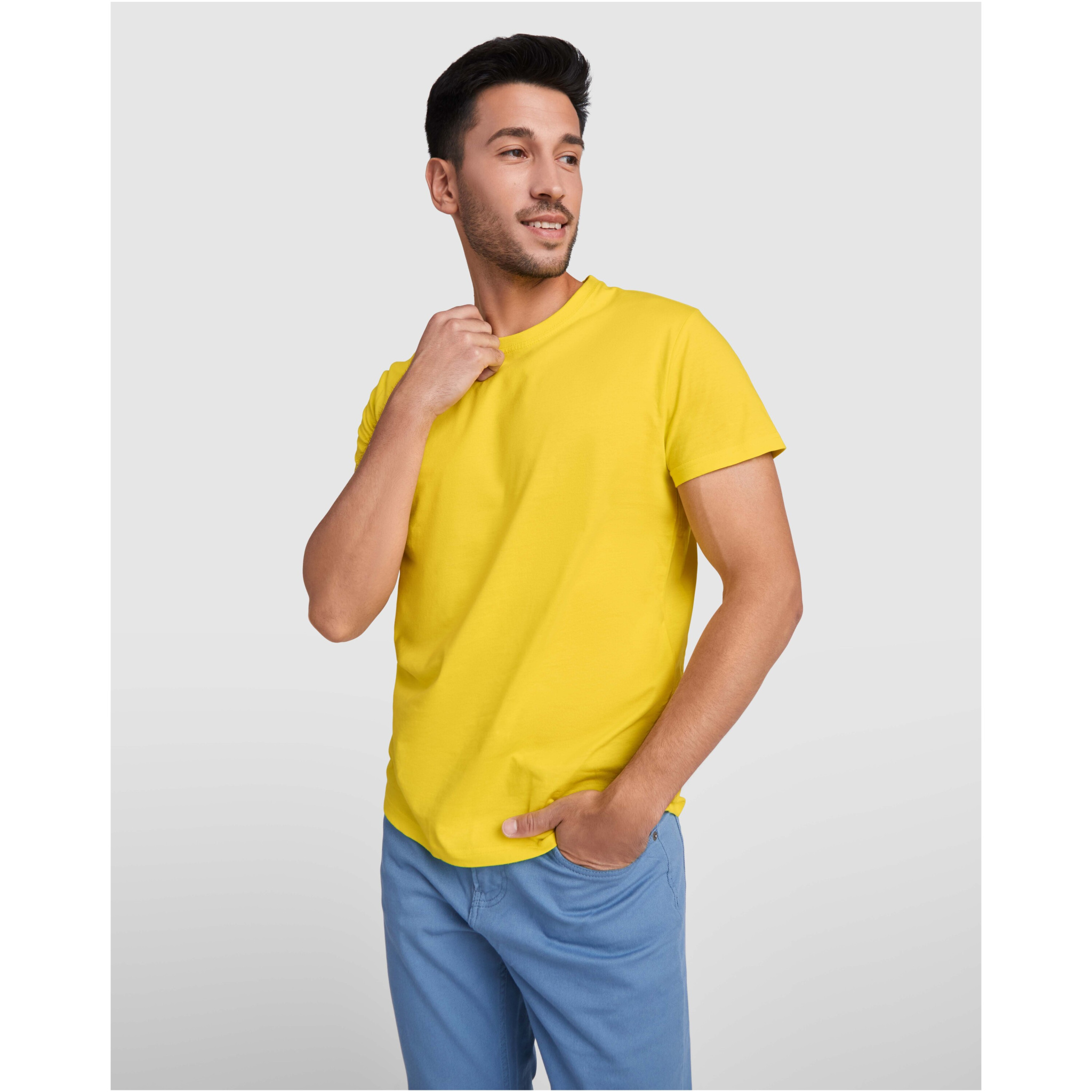 Lyhythihainen t-paita, jossa 4-kerroksinen pyöreä pääntie ja vahvistetut peitetyt saumat kauluksessa ja olkapäissä. Sivusaumat. Kokoja 4XL ja 5XL saa vain tietyissä väreissä. Irrotettava etiketti.
