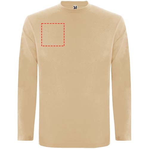 Pitkähihainen tuubikudottu t-paita, nelikerroksinen pyöreä pääntie. Vahvistettu sauma pääntiessä ja olkapäissä. Hihoissa ei ole resoreita. Irrotettava tuotemerkki. Tuubikudottu malli aikuisten koossa ja sivusaumat lasten koossa. Kuvan malli on 185 cm pitkä ja hänellä on päällään koko L.