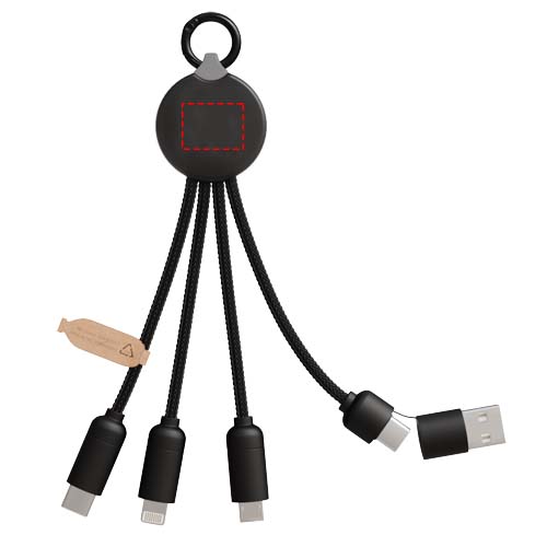 5-in-1-latauskaapeli, jossa on 3 liitintä (Type-C, Android, iPhone) ja rPET-johdot (valmistettu kierrätetyistä muovipulloista). USB-A- ja USB-C-liittimen ansiosta kaapeli on täysin yhteensopiva markkinoiden uusimpien tietokoneiden (USB-C) kanssa. Kärjissä metallia muistuttava pinta. Kaapelilla voi ladata jopa 3 laitetta samanaikaisesti. Toimitetaan kierrätettävässä rasiassa kierrätyspaperikortilla.