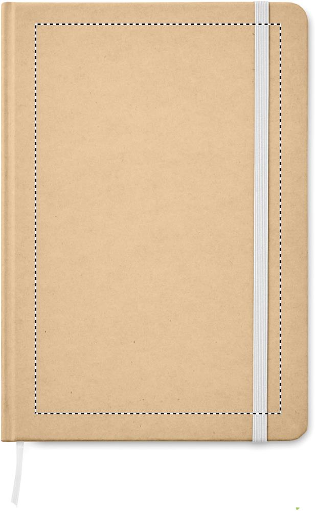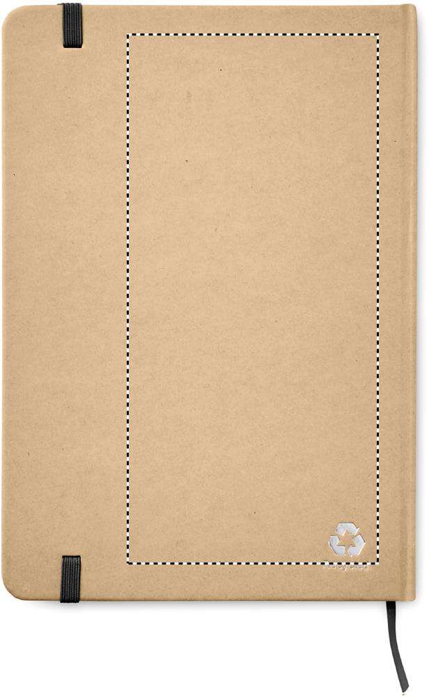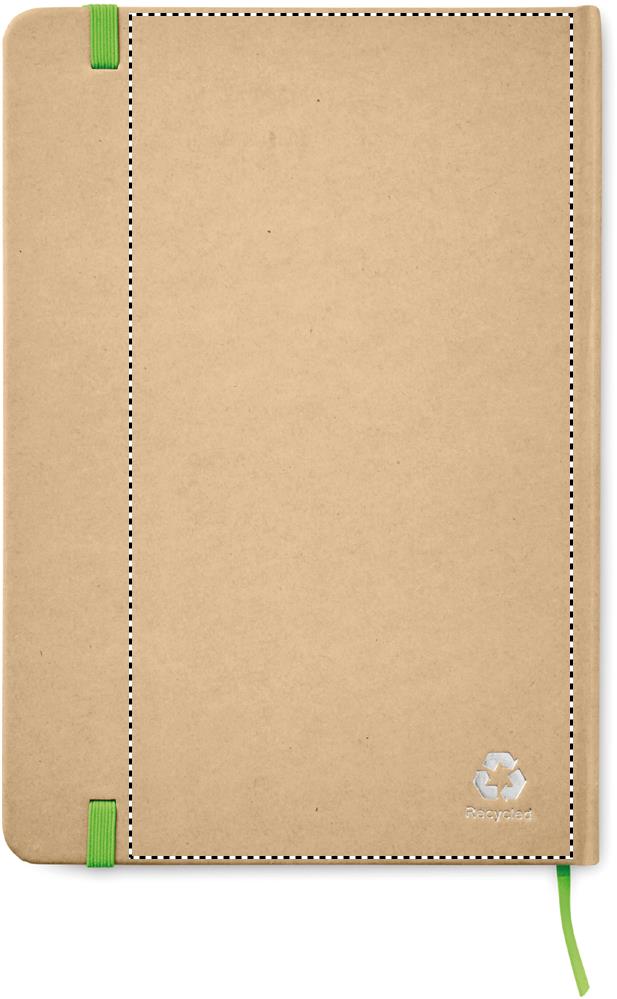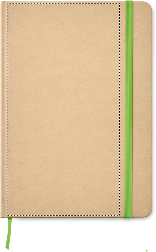 A5 formato užrašų knygelė su kietu perdirbto kartono dangteliu. Byla. 160 linijuotų puslapių (80 lapų). Elastinis užsegimo dirželis, kaspininė žymė.