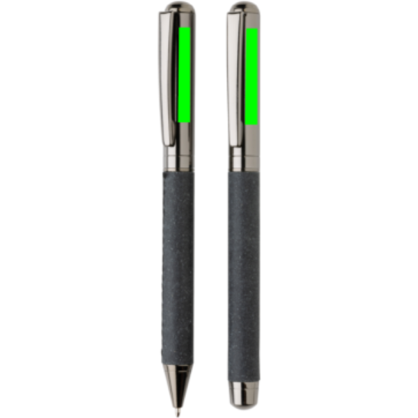 Šis gražus rašiklių rinkinys pagamintas iš perdirbtos odos. Šis rinkinys pasižymi elegantišku gunmetal spalvos dizainu, yra stilingas ir puikiai tinka užrašams stilingai. Jame yra kamuoliukas ir rutulys. Kiekviename rašiklyje yra mėlynos spalvos dokumentinis rašalas. Rašiklio rašymo ilgis yra 1200 metrų, o ritininio rutulio - 400 metrų. Rašiklio rinkinys yra perdirbtos odos maišelyje ir dovanų dėžutėje su perdirbtos odos raštu.