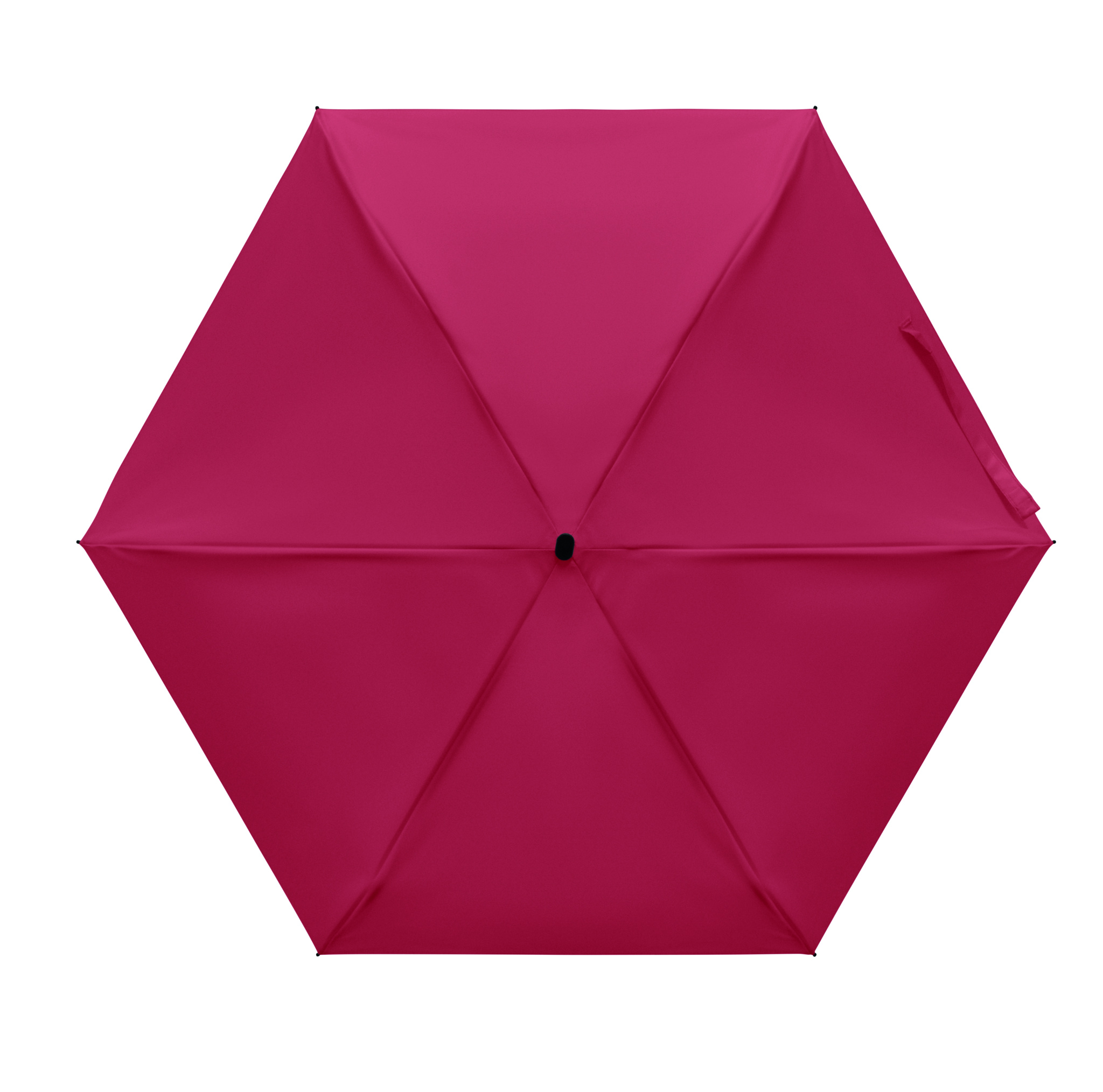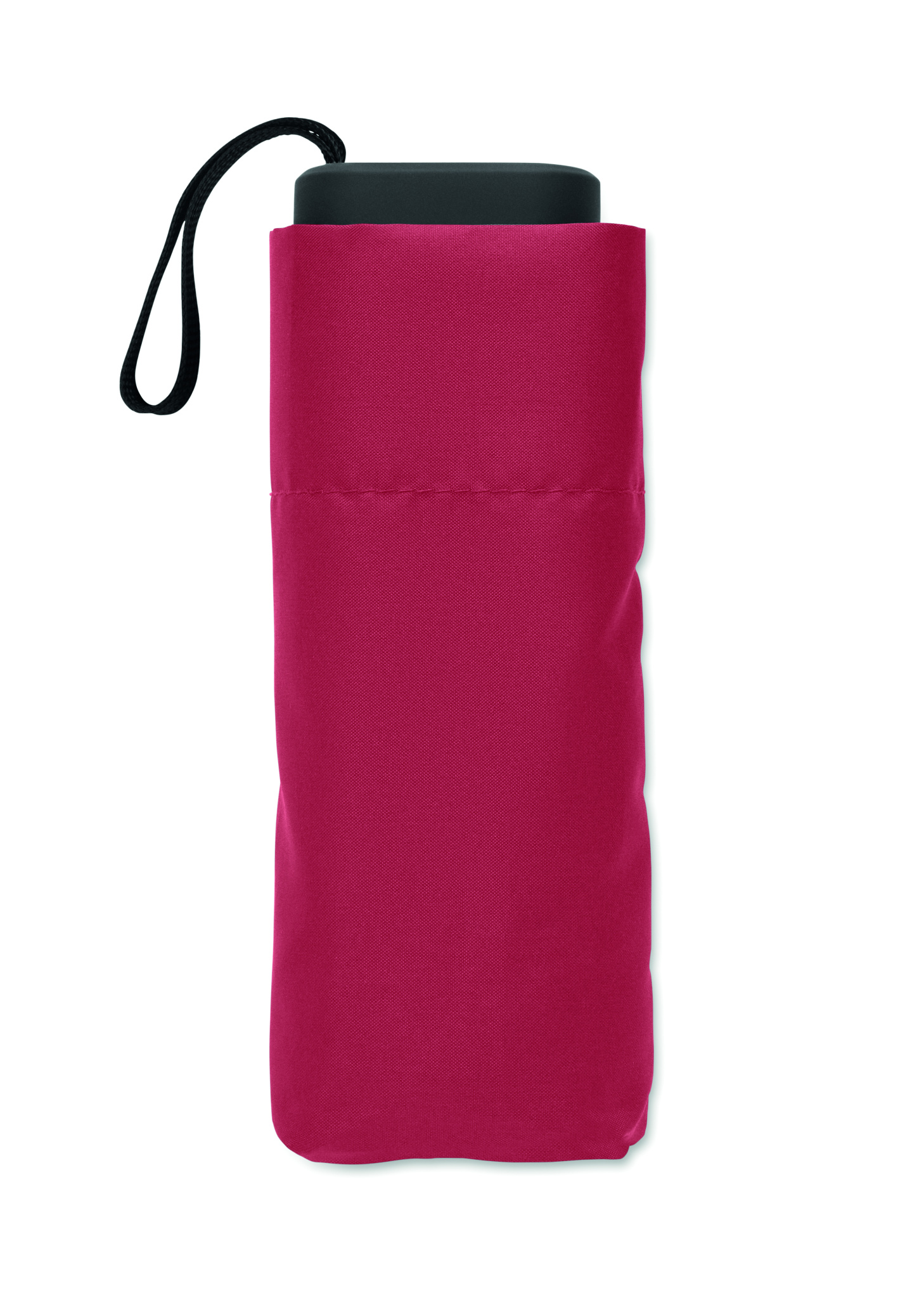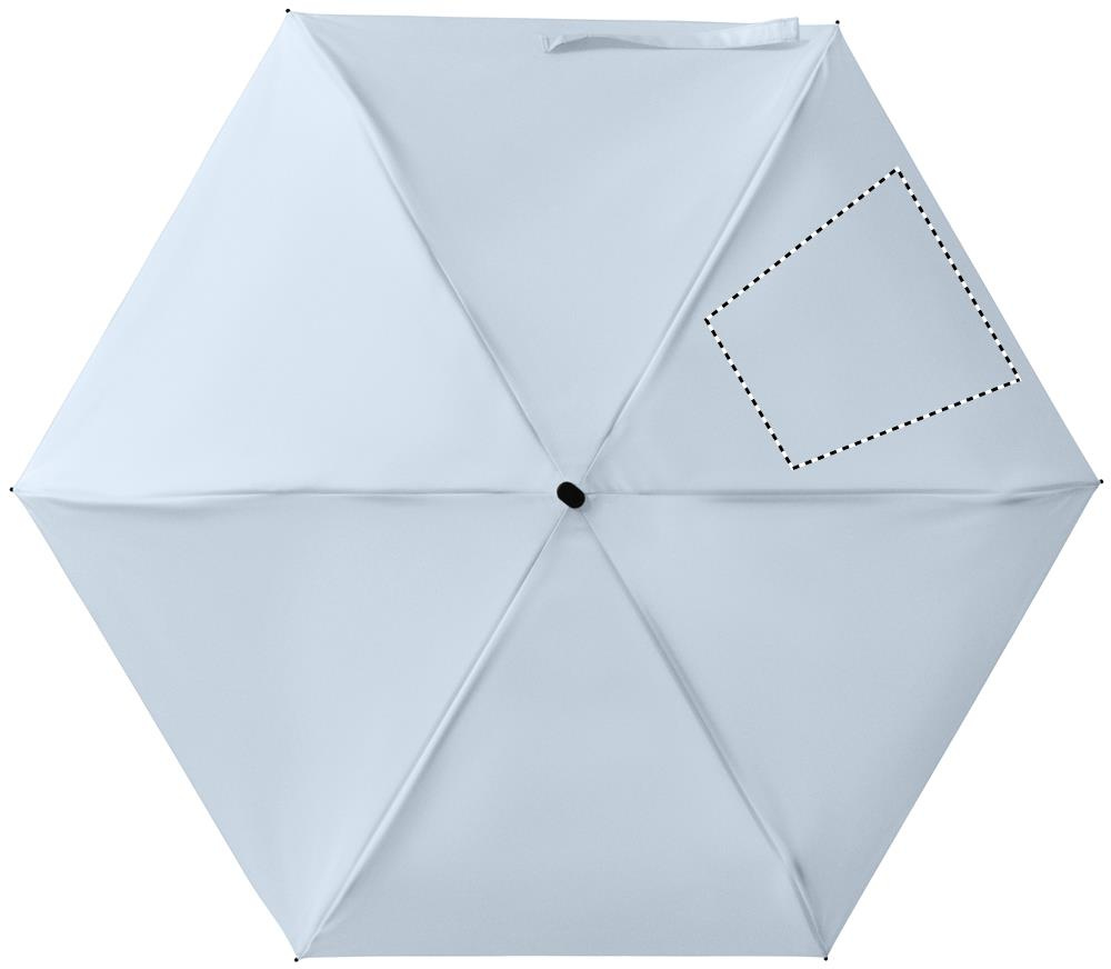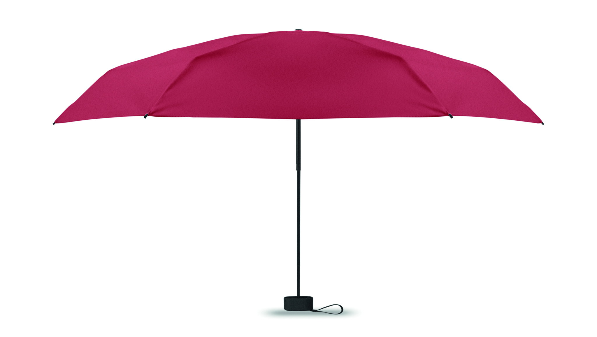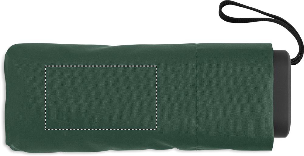 19-inch 5-fold manual umbrella made of 190T pongee with matching pouch. It has a metal and fibreglass windproof frame, black rubberized handle with wrist strap, and compact 17 cm folded size.
