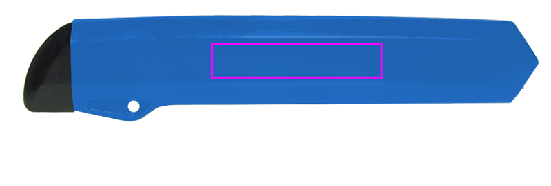 Нож для картона из пластика с отламывающимся лезвием (семь частей лезвия). На закрытой части пластикового корпуса печатаем ваш логотип.