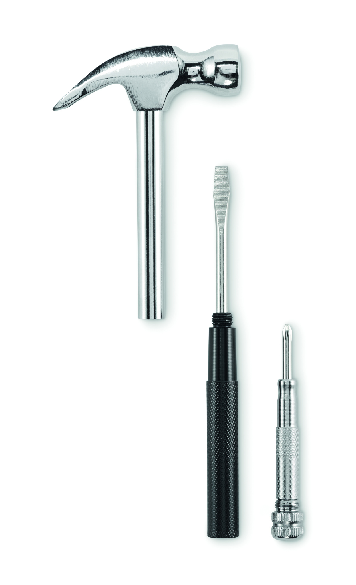 Claw hammer and screwdriver in carbon steel. Includes 4 bits screwdrivers integrated in handle.