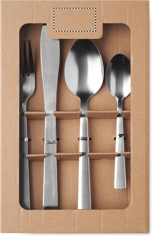 Набор столовых приборов из нержавеющей стали на 4 персоны, 16 предметов. В набор входят: чайная ложка, столовая ложка, вилка, нож. Поставляется в коробке из крафт-бумаги. Нанесение только на коробке.