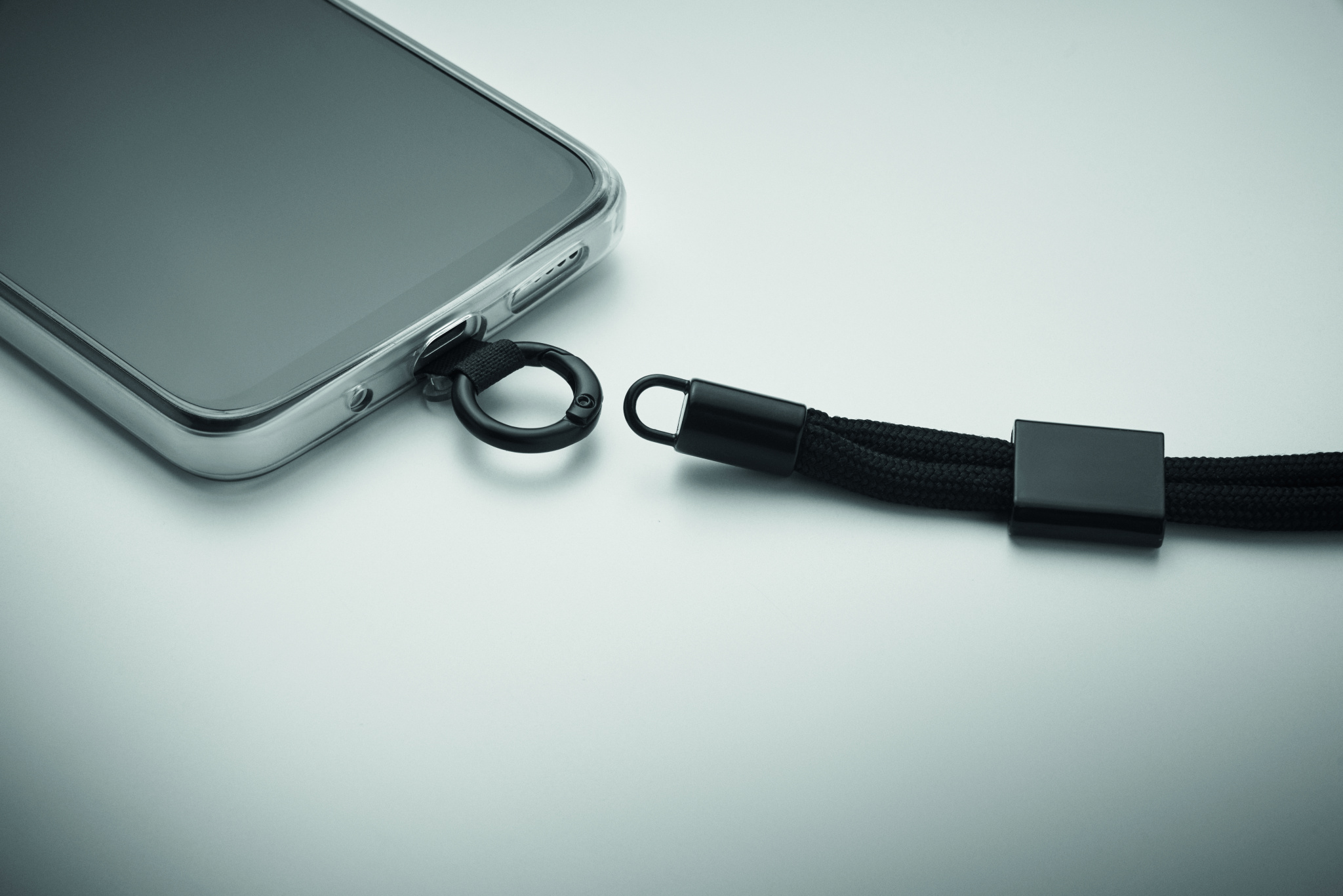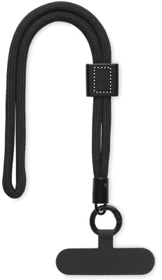 Adjustable phone cord holder wrist strap in RPET polyester. Length 25 cm.