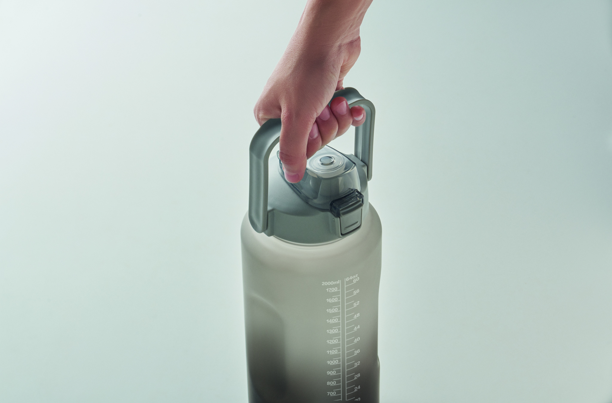 Motivational water bottle in RPET. Features a one-hand open flip-top lid with straw, safety lock, and handle. Leak-free. Capacity : 2000 ml