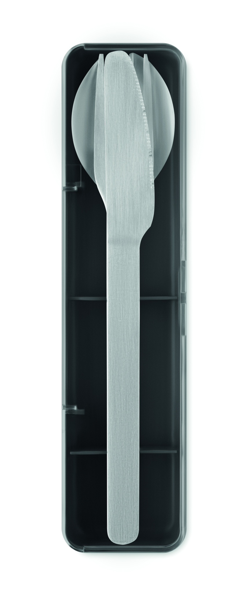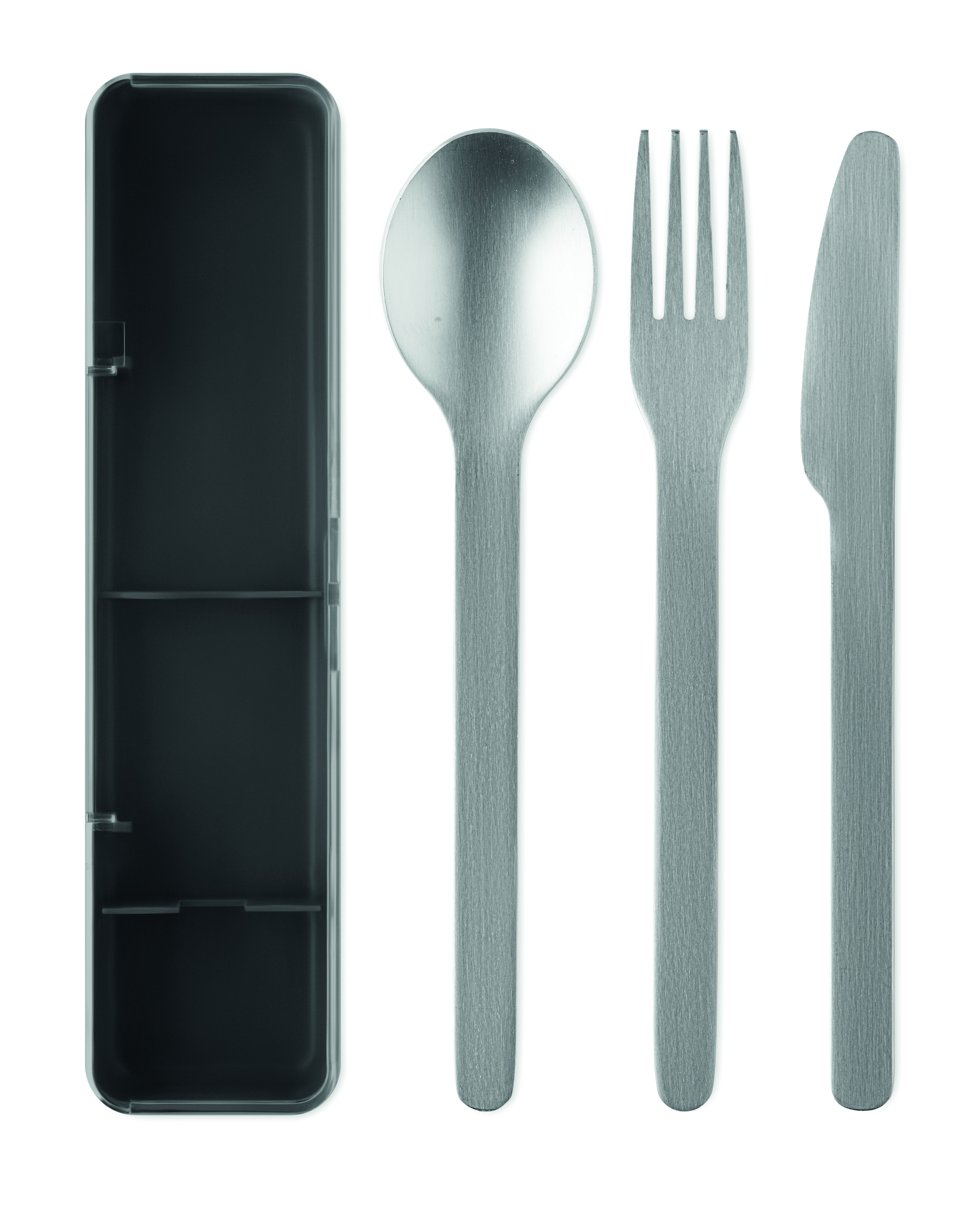 Stainless steel cutlery set with PP case. This set includes a fork, knife and spoon.