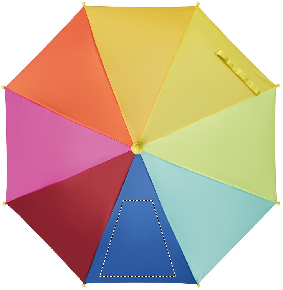 Детский зонт 18 дюймов из эпонжа 190T с радужным рисунком. 8 панелей. Ручное открытие и закрытие. Стекловолоконные стержень и каркас. Пластиковая изогнутая ручка и наконечники.