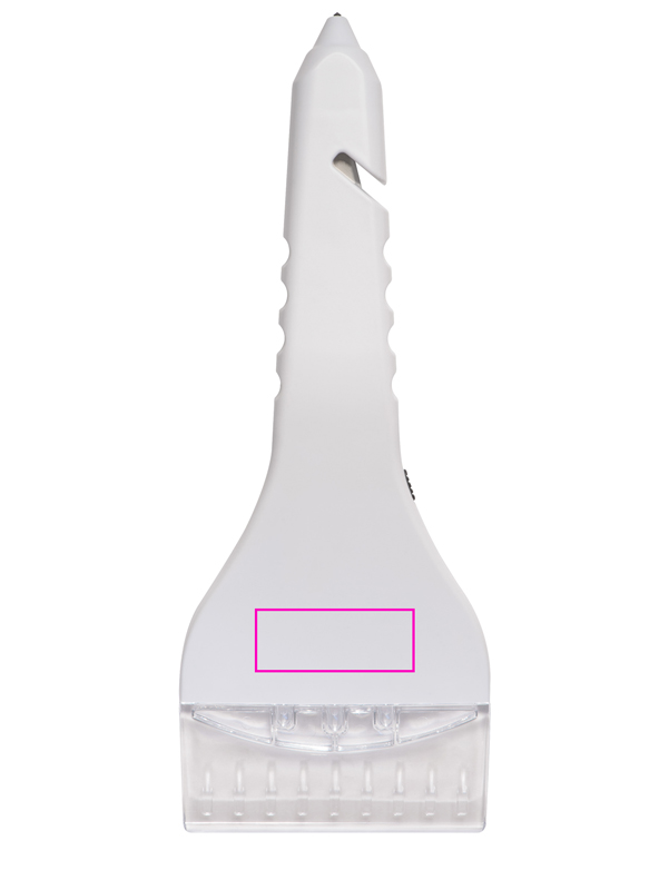 4-i-1 isskrapa av ABS. Isskrapan fungerar även som bälteskärare, glashammare eller, tack vare sina 3 lysdioder, som ficklampa. Vi trycker din logotyp centrerad på skrapan.