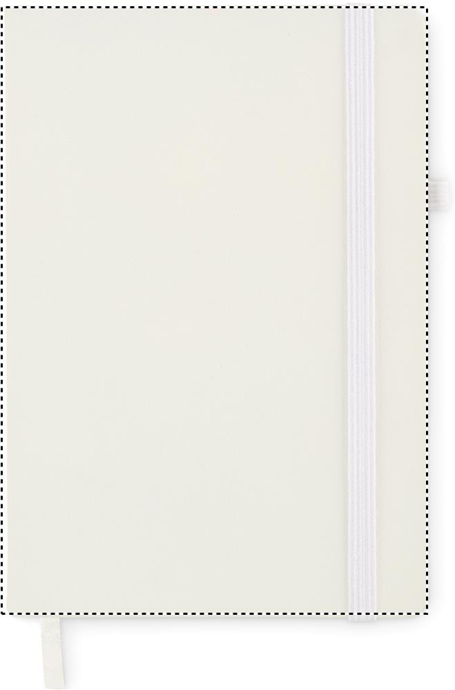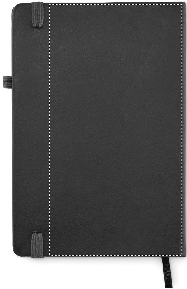 A5-anteckningsbok med omslag av 70% återvunnet läder och 30% latex-PU. Bunden pärm, 192 linjerade sidor i återvunnet papper (96 ark). Matchande elastisk band och pennhållare.