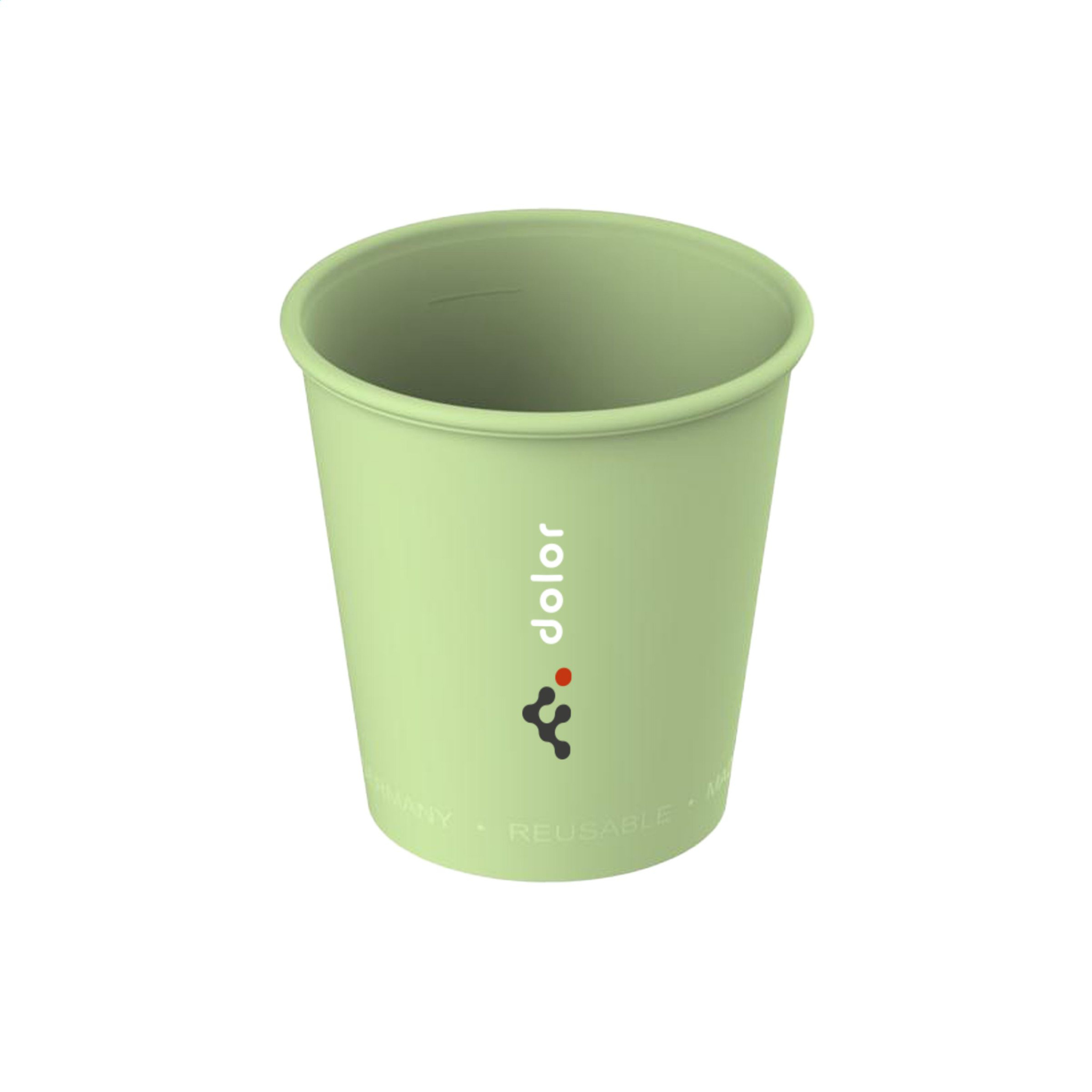 Återanvändbar drickskopp av plast. Utmärkt att använda som standard återanvändbar kopp med kaffemaskin. Det perfekta alternativet till kaffekoppen för engångsbruk. Genom att byta till en återanvändbar kopp hamnar miljarder färre koppar i avfallet. Denna vackra kopp är 100 % återvinningsbar, BPA-fri och stapelbar. Kapacitet 200 ml. Tillverkad i Tyskland. Minsta beställning 100 stycken per färg.