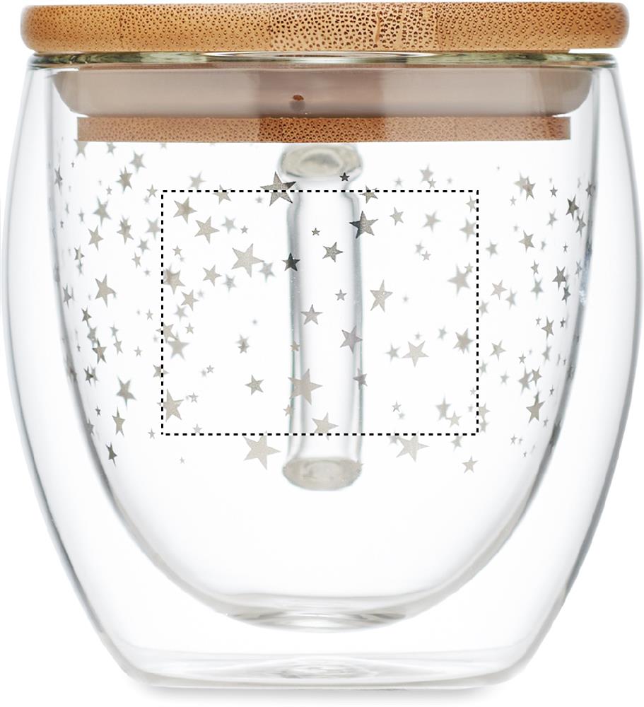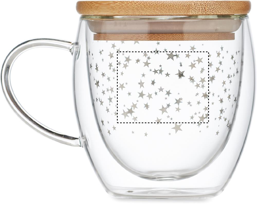 Dubbelväggig borosilikatmugg med stjärnor och bambulock. Kapacitet: 220 ml.