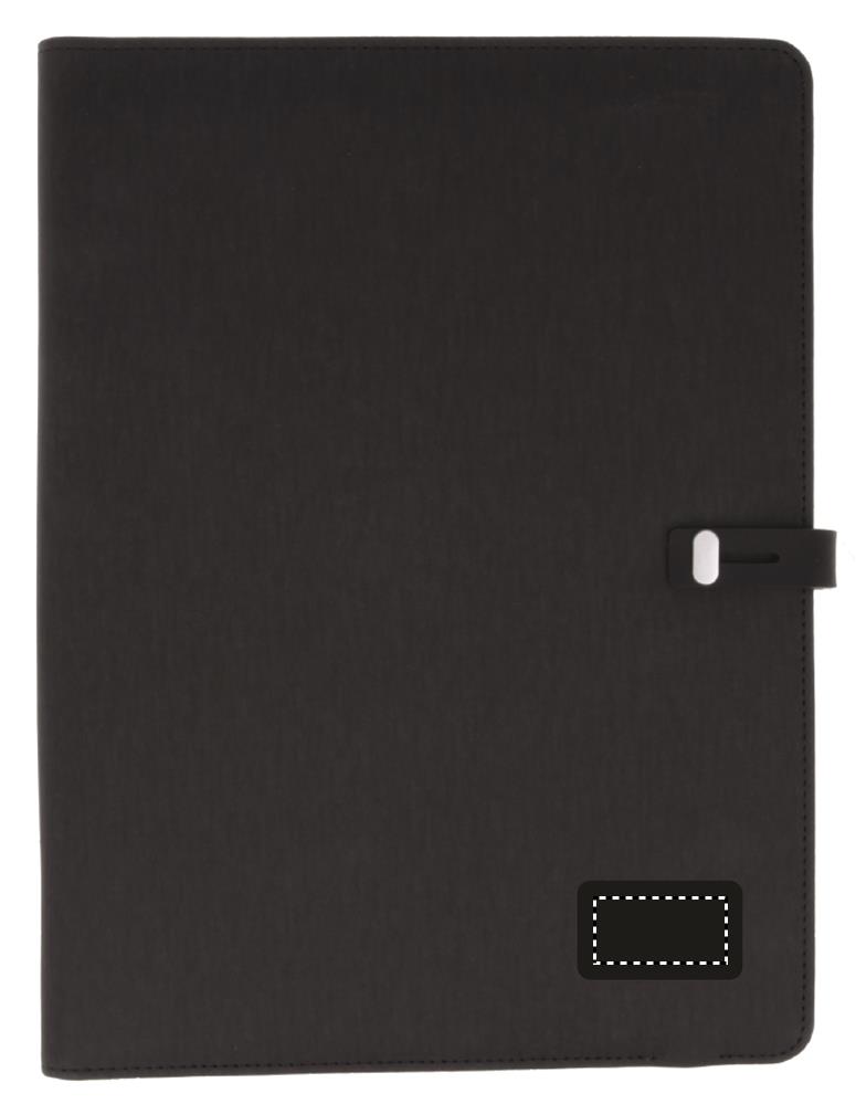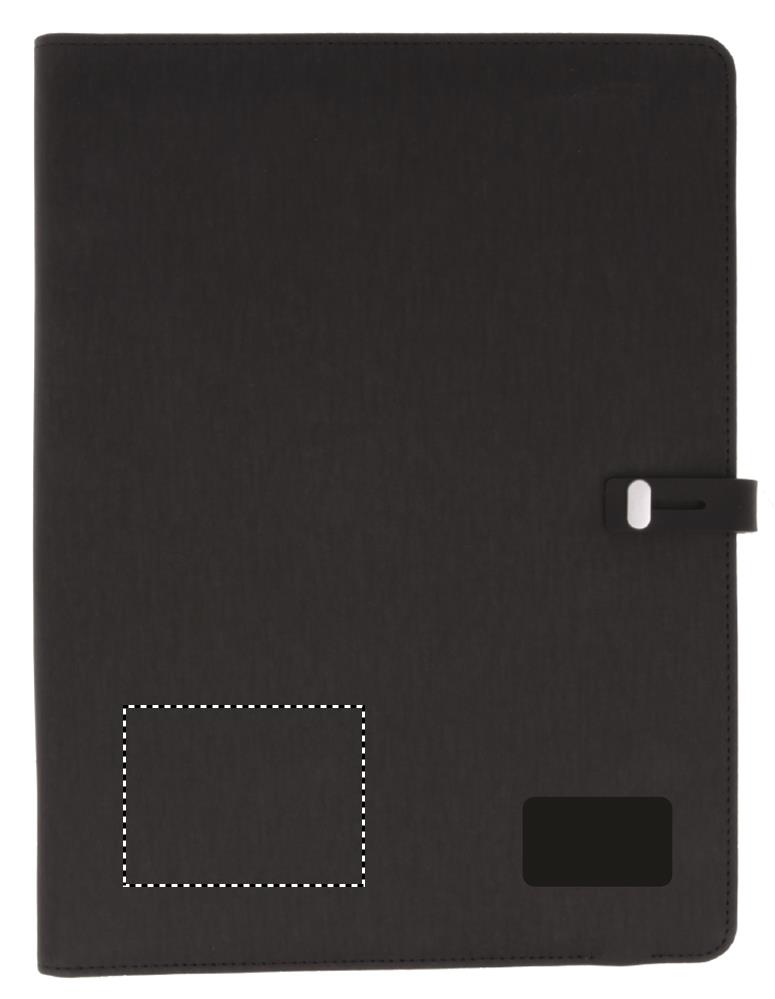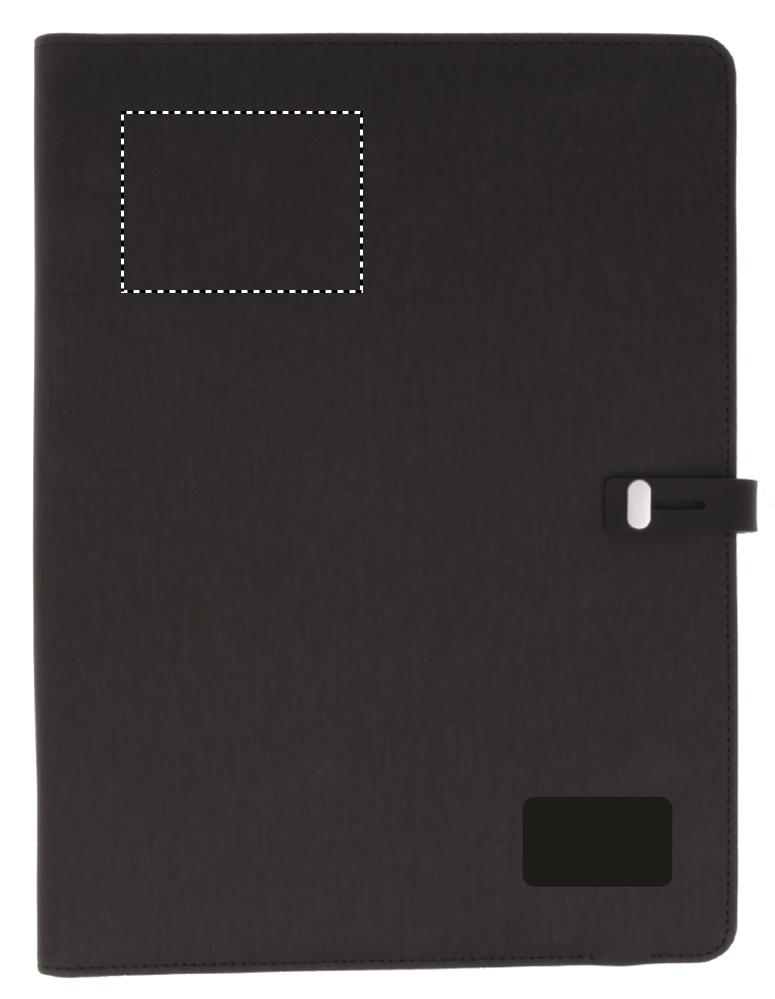 Konferensmapp i A4 storlek i stilren design med magnetknäppning. Yttermaterial PU med insida med textil känsla. Inbyggd 4000mAh DC5V/1.0A trådlös Power Bank för QI kompatibla telefoner. Kan också laddas vanligt med medföljande micro USB eller Typ C kontakter. 20 sidigt anteckningsblock och fickor på insidan.