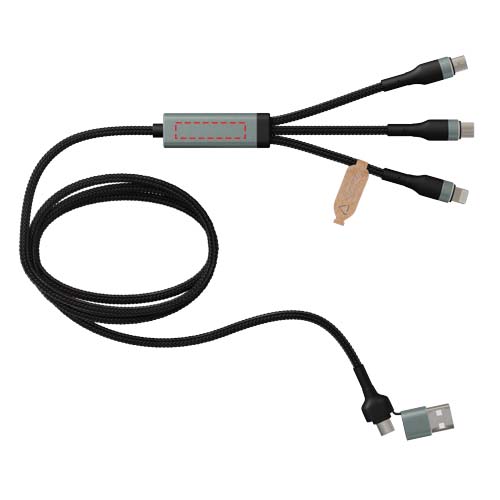 5-i-1 ultrasnabb rPET 100 W ultrasnabb laddningskabel som kan ladda smartphones, surfplattor och bärbara datorer. Den dubbla USB-A + USB-C-ingången gör kabeln 100 % kompatibel med de senaste datormodellerna. Utgång Typ-C, Micro USB och lightning. Levereras med återvinningsbar TPU-påse och en inlaga av återvunnet papper. Kabellängd: 1 meter.